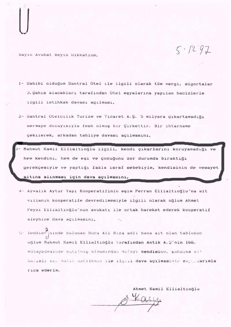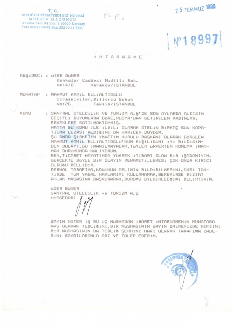 SERRA ELLİALTIOĞLU'NUN BABASI MAHMUT KAMİL ELLİALTIOĞLU, ÖZER GÜNER HUSUMETİNİN İÇYÜZÜ.. MAHMUT KAMİL ELLİALTIOĞLU, BABASININ VE ŞİRKET ORTAĞI ÖZER GÜNER'İN HİSSELERİNİ KANUNSUZ OLARAK ELEGEÇİRİP, ESKİ KARISI İ.ESRA TÜRSEN (KAYATÜRK) İLE BİRLİKTE ÇALIŞTIRDIĞI OTELİN SÜREKLİ AHLAK ZABITASINCA KAPATILMASI KARŞISINDA, ORTAĞI ÖZER GÜNER'İN BU DAVRANIŞLARDAN BİR AN EVVEL VAZGEÇMESİ İÇİN KENDİSİNE ÇEKTİĞİ İHTARNAME