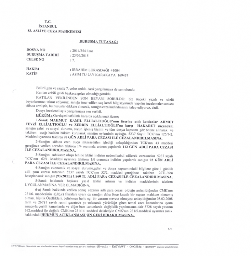 Mahmut Kamil ELLİALTIOĞLU için bir bir ortaya çıkıyor. Ne kadar inkar etse de internet ortamından Ahmet ELLİALTIOĞLU ve Zerrin ELLİALTIOĞLU'na yaptığı suçlama, iftira, yalan ve hakaretlere, yargı gerekli cezayı verdi..