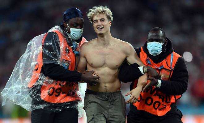İtalya kalecisi Donnarumma'ya doğru ilerleyip daha sonra koşmayı bırakan ve görevlilere teslim olan taraftarın güldüğü anlar objektiflere yansıdı.Yaklaşık 1 dakika boyunca görevlilere zor anlar yaşatan ve çok eğlendiği gözlenen taraftar, güvenlik güçleri tarafından dışarı çıkarıldı.