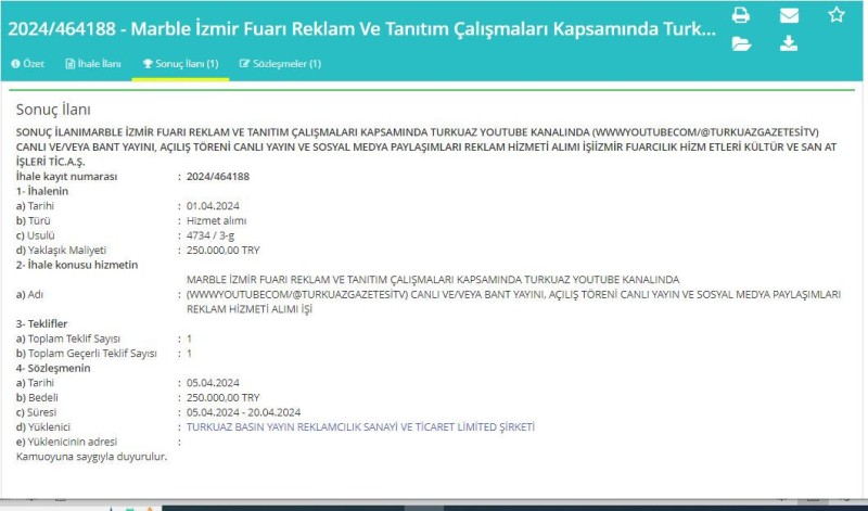 İzmir Büyükşehir Belediyesi'nin iştiraklerinden olan İZFAS, 19 Şubat 2024 tarihinde ‘’Marble Fuarı Reklam Ve Tanıtım çalışmaları Kapsamında Tümmer Youtube Kanalında Canlı Yayın, Spot Reklam, Bant Reklam Ve Banner Reklam Hizmeti Alımı’’ başlığıyla bir hizmet alım ihalesi düzenledi. 17-20 Nisan tarihleri arasında düzenlenecek fuarın reklam filmlerinin yayınlandığı Youtube kanallarından biri de 136 takipçisi olan ve Ankara'dan yayın yapan Tümmer kanalı oldu. Fuar için hazırlanan iki ayrı reklam filmi Nisan ayında bu kanalda yayınladı. Filmi görüntüleyen kişi sayısı ise sadece 52 oldu. 1 Mart 2024 tarihinde sözleşmesi yapılan ihalenin bedeli ise 500 bin lira oldu. Bin 200 takipçisi olan Turkuaz TV’ye de 1 Nisan 2025 tarihinde aynı başlıkla 250 bin liralık reklam ihalesi verildi. Fuardan önce Youtube kanalında yayınlanan reklamı görüntüleyen kişi sayısı ise sadece 33 kişi olmuş. Belediyenin iki Youtube kanalında yayınladığı reklamları toplamda 85 kişi görüntülemiş.
