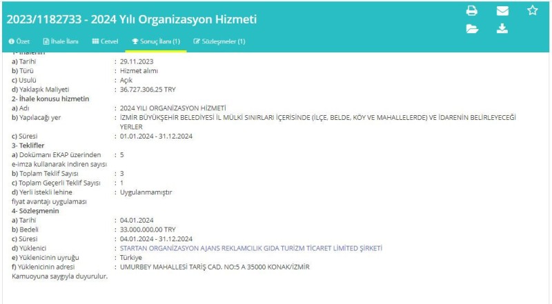MedyaRadar’da geçtiğimiz hafta ‘Kamuda tasarruf dediğin böyle olur’ başlıklı haberden sonra Startan Organizasyon isimli firma avukatlarından ‘Sıla konserinin organizasyonu biz yapmadık’ açıklaması geldi. İzmir Büyükşehir Belediyesi Satınalma Daire Başkanlığı 29 Kasım 2023 tarihinde ‘2024 yılı organizasyon hizmeti. İzmir il sınırları içerisinde idarenin belirleyeceği yerler’ başlıklı bir ihale düzenledi. ‘Hizmet alımı’ usulüne göre yapılan ihalenin yaklaşık maliyeti 46 milyon 727 bin lira olarak belirlendi. Rekabet koşullarının oluşmadığı ihaleye sadece Startan Organizasyon isimli firma katıldı. 4 Ocak 2024 tarihinde yapılan ihalenin sözleşmesi ise 33 milyon lira olmuş. Bu ihale kapsamında İzmir Büyükşehir Belediyesi 2024 yılı boyunca konser organizasyonlarında sahne kurulumu ve ses sistemlerini düzenleme işini Startan Organizasyon isimli firmaya vermiş. İhale çok önceden imzalandığı için sanatçı isimleri şartnamede yer almadı.