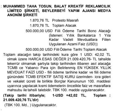 Muhammed Taha Tosun 'Zarar ettim' diyerek parayı daha sonra defalarca kez ödeyeceğini söylese de sözünü tutmadı. Yatırımcı 15 Ekim 2025 tarihinde imzalanan 500 bin dolarlık senedi devreye soktu. İstanbul Anadolu 14'ncü İcra Dairesi İcra memurları hem eski AK Parti Milletvekili Resul Tosun'un evine, hem de oğlunun evine icraya gitti. Resul Tosun, dizinin yatırımcı ortağını 'Parayı ben ödeyeceğim' diyerek arasa da sözünü tutmadığı iddia edildi.