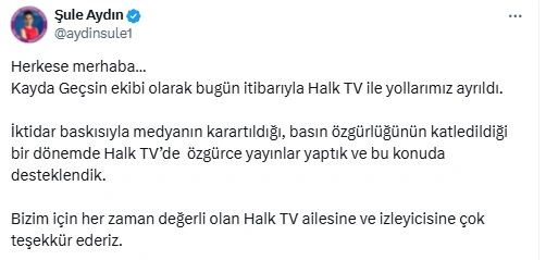 Kayda Geçsin program ekibinden Şule Aydın'da bugün sosyal medya hesabından yaptığı bir paylaşımla "Kayda Geçsin ekibi olarak bugün itibarıyla Halk TV ile yollarımız ayrıldı." ayrılık haberini duyurdu.