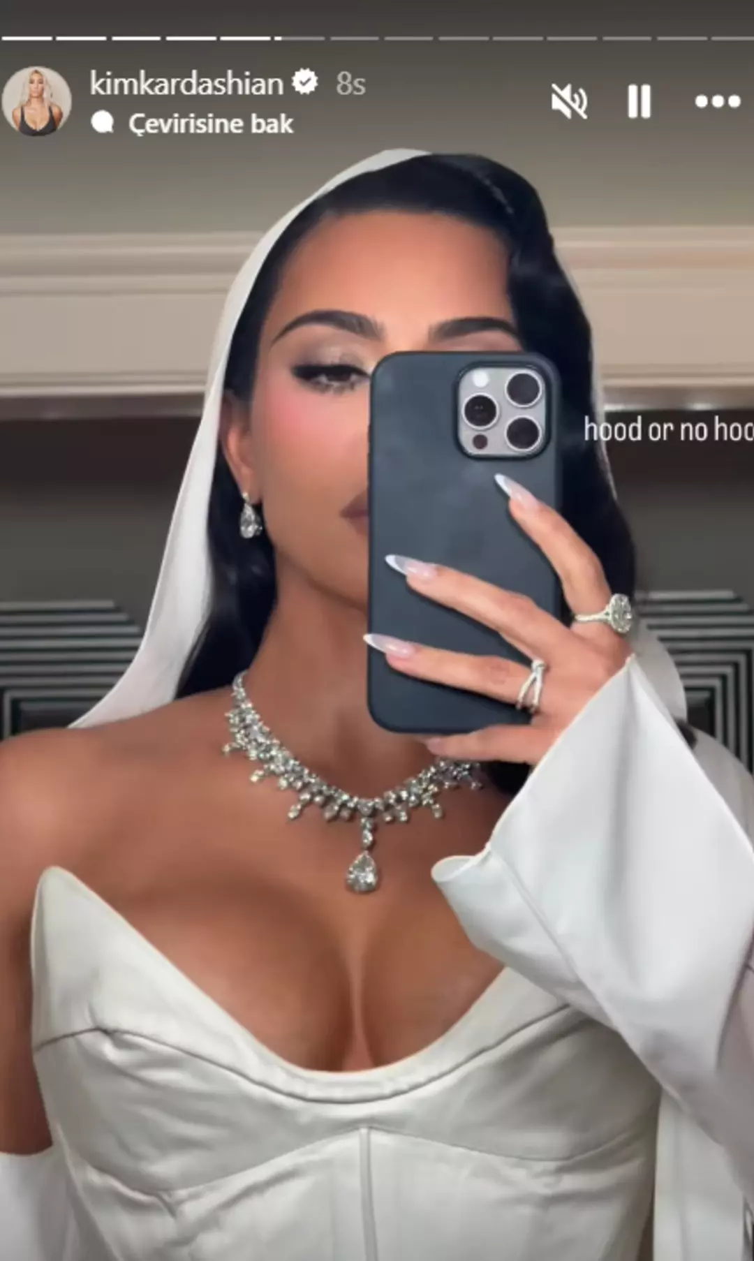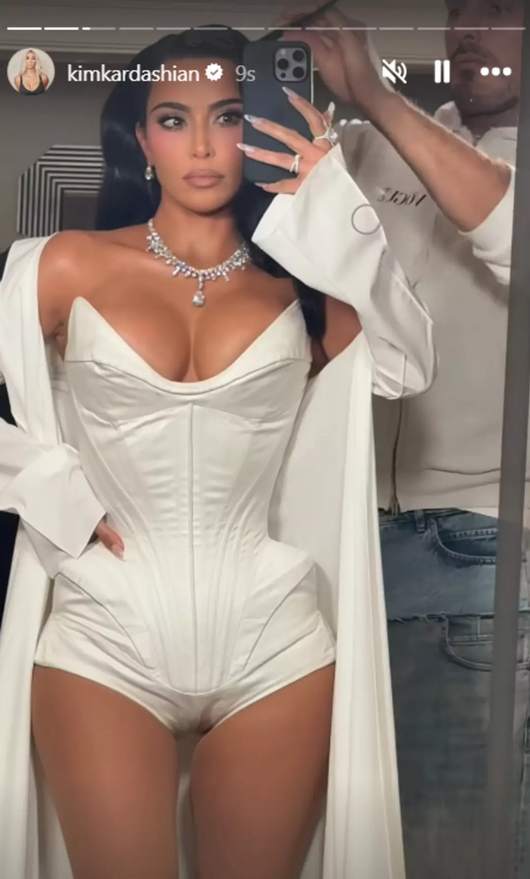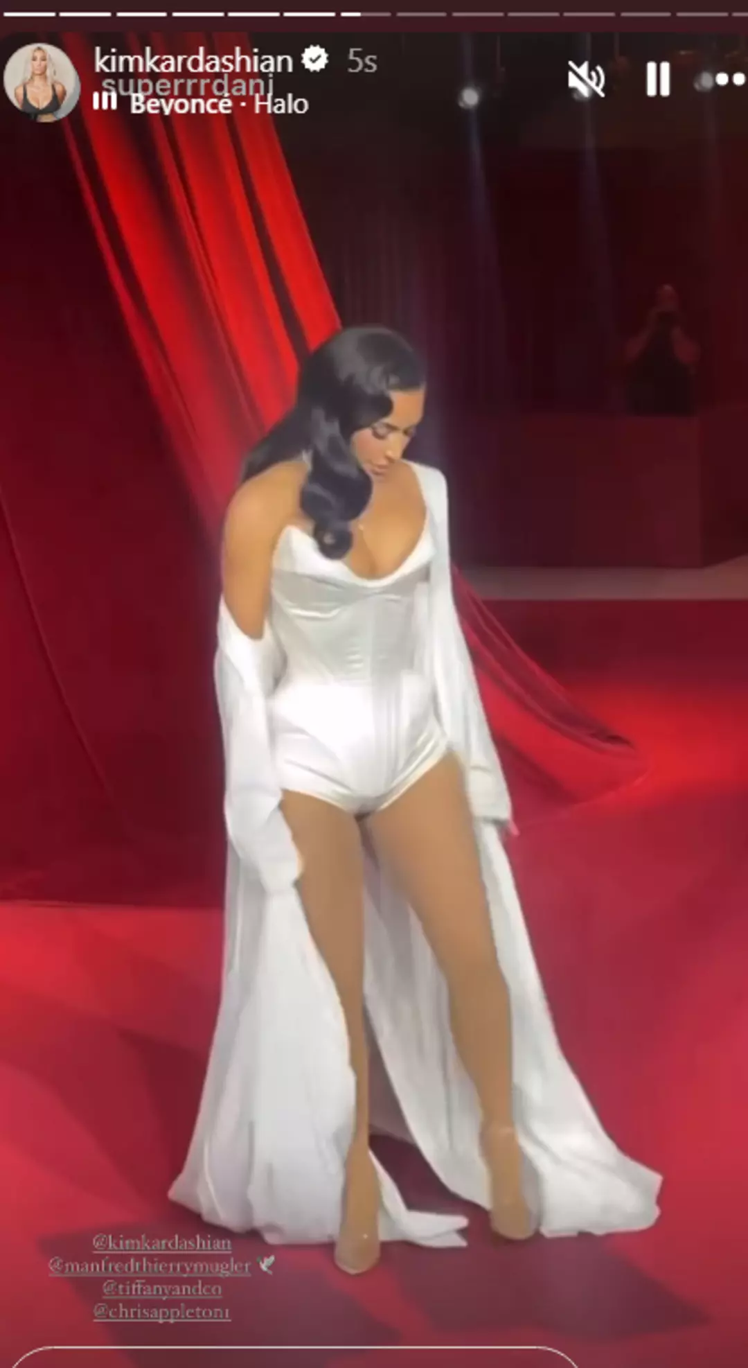 Etkinlik için Kardashian, Tiffany & Co'dan 30 karat değerinde elmas takarken göz kamaştırıcıydı. Merkezinde büyük bir değerli taş bulunan büyüleyici bir kolye ile dekoltesini vurguladı ve ayrıca küpelerinde ve yüzüklerinde de zengin mücevherlerle aksesuarlar kullandı.