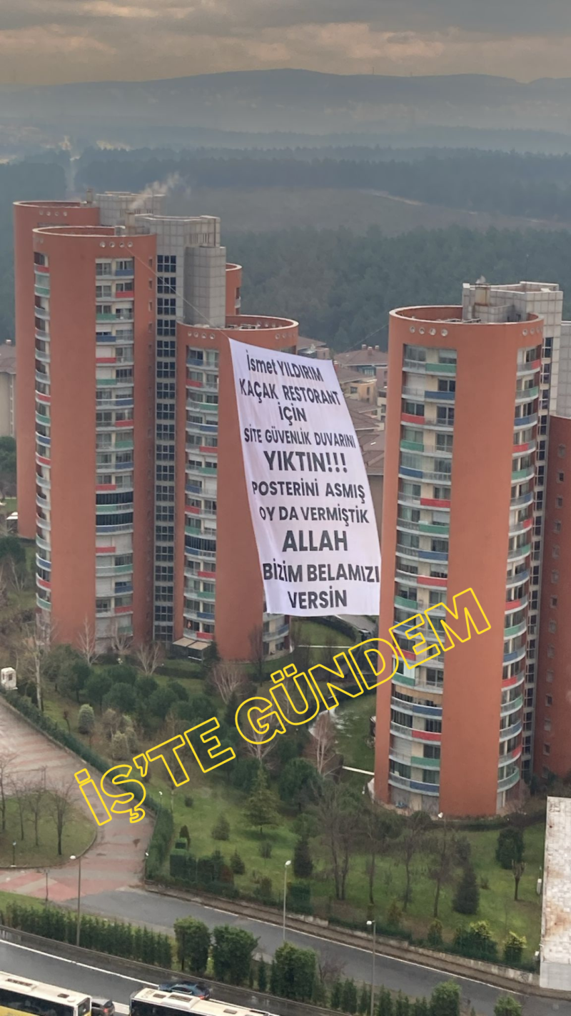 İş'te Gündem'in haberine göre Ümraniye Belediye Başkanı İsmet Yıldırım'ı hedef alan pannkartta, "İsmet Yıldırım, kaçak restorant için site duvarını yıktın. Posterini asmış, oy da vermiştik. Allah bizim belamızı versin" yazıyor.