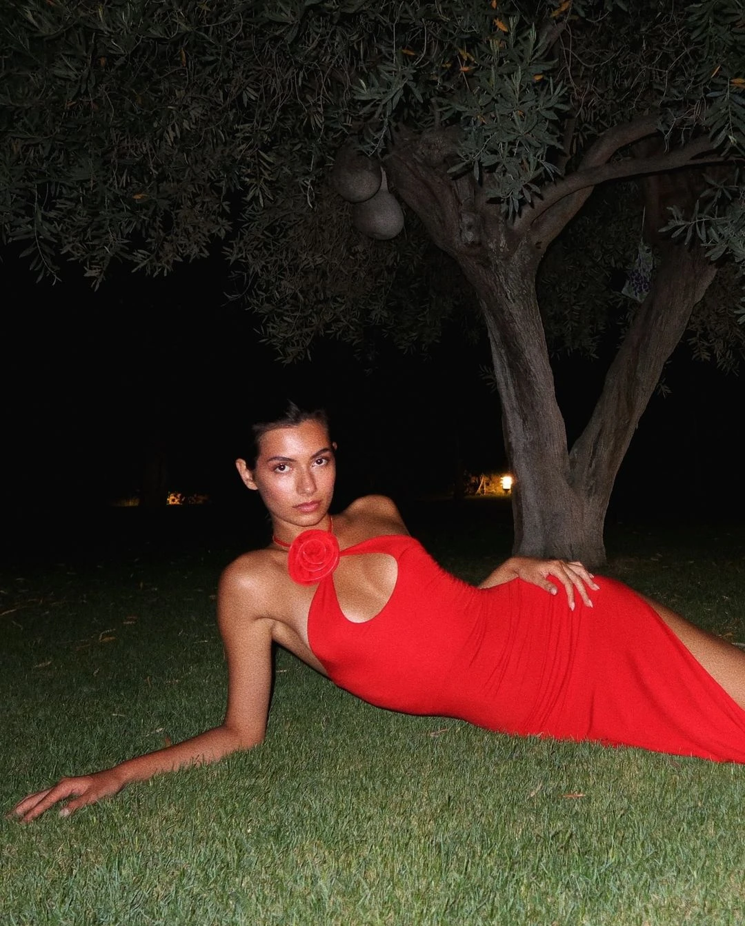 Kırmızı derin yırtmaçlı elbisesiyle tüm dikkatleri üzerine çeken Buse İskenderoğlu, parti sonrası çimlerin üzerine yatarak yorgunluk attı.