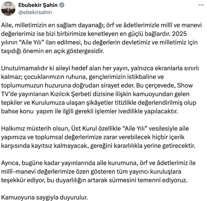 Unutulmamalıdır ki aileyi hedef alan her yayın, yalnızca ekranlarla sınırlı kalmaz; çocuklarımızın ruhuna, gençlerimizin istikbaline ve toplumumuzun huzuruna doğrudan sirayet eder. Bu çerçevede, Show TV'de yayınlanan Kızılcık Şerbeti dizisine ilişkin kamuoyundan gelen tepkiler ve Kurulumuza ulaşan şikâyetler titizlikle değerlendirilmiş olup bahse konu yapım ile ilgili gerekli işlemler ivedilikle yapılacaktır.