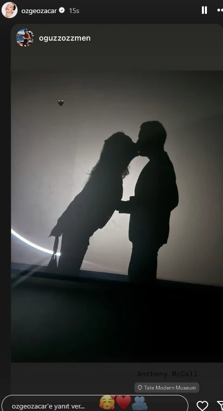 Küçük bir aşk tatiline çıkan Özacar ve Özmen çifti gittikleri Tate Modern Müzesi'nde gölgeleri ile romantik poz verdi. Kareyi sosyal medya hesaplarında paylaşan çifte beğeni yağdı.
