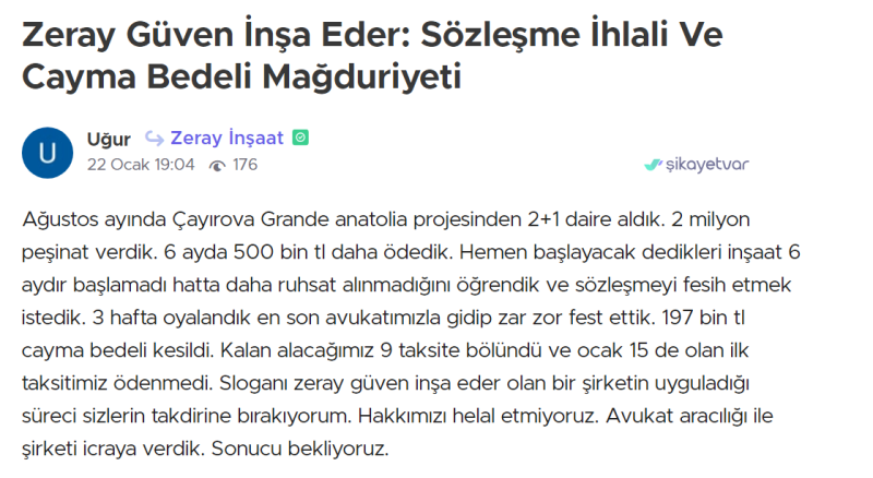 Zeray İnşaat'ın şikayet var sitesinde hakkında yüzlerce şikayet mevcut o şikayetlerden bazıları;