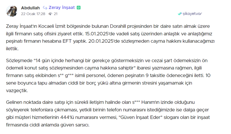 Zeray İnşaat'ın Kocaeli İzmit bölgesinde bulunan Dorahill projesinden bir daire satın almak üzere ilgili firmanın satış ofisini ziyaret ettik. 15.01.2025'de vadeli satış üzerinden anlaştık ve anlaştığımız peşinatı firmanın hesabına EFT yaptık. 20.01.2025'de sözleşmeden cayma hakkını kullanacağımızı ilettik.