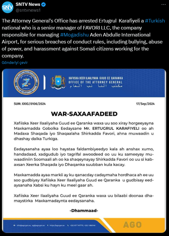 Serbestiyet'in haberine göre, Mogadişu’daki havalimanı işleten Favori Airpors şirketinin İnsan Kaynakları Müdürü Ertuğrul Karaferiyeli, Somalili 4 kadın çalışanına cinsel tacizde bulunduğu suçlamasıyla tutuklandı.