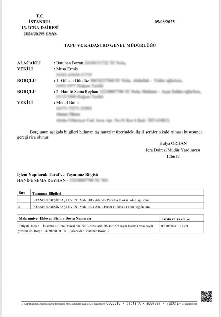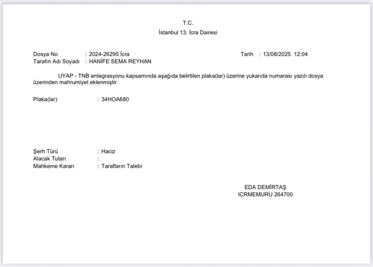 Dava süreci devam ederken Hanife Sema Reyhan’ın vekili Ahmet Ökten, duruşma tutanağında hacizlerin kaldırılmasına dair bir karar varmış gibi İstanbul 13’ncü İcra Dairesi’ne tedbir konulan mallar üzerindeki hacizlerin kaldırılması için başvuruda bulundu. İcra Müdür yardımcısı Hülya Orhan, iddialara göre kendi yönlendirmesiyle yapılan başvurudan sonra iki daire ve iki araç üzerindeki hacizleri kaldırdı. Haczi kalkan ve piyasa değeri 5 milyon TL olan lüks araç kısa sürede satıldı. Diğer araç ve evler satılmak üzereyken davacının şikayetiyle mallara yeniden haciz konuldu.
