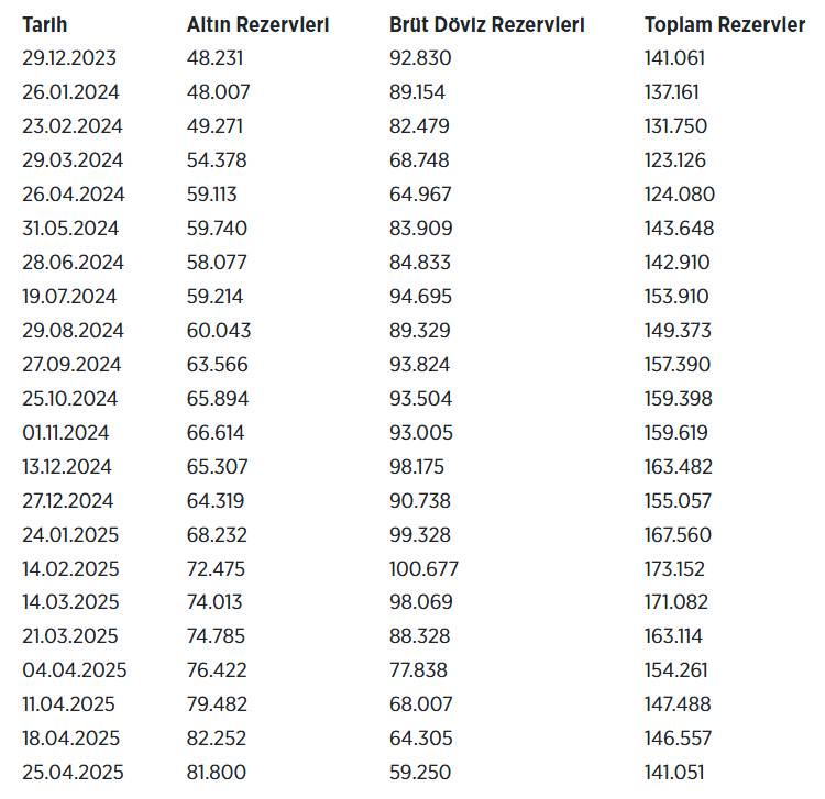 Türkiye Cumhuriyet Merkez Bankası’nın 25 Nisan haftasına ait para ve banka istatistiklerine göre, toplam rezervlerde dikkat çekici bir azalma yaşandı. Brüt döviz rezervleri, önceki haftaya kıyasla 5 milyar 55 milyon dolar düşerek 59 milyar 250 milyon dolara geriledi. Aynı dönemde altın rezervleri ise 452 milyon dolar azalışla 81 milyar 800 milyon dolara indi. Böylece TCMB’nin toplam rezervleri 5 milyar 506 milyon dolarlık düşüşle 141 milyar 51 milyon dolara gerilemiş oldu.