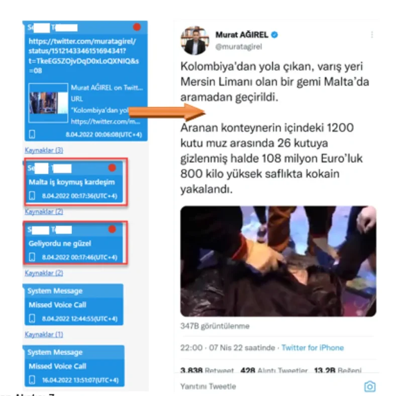 Eyyüp Acar’ın telefonunun incelenmesinde kendisinden sorumlu narkotik polisi S.T. ile dikkat çeken bir mesajlaşması var. Polis S.T., gazeteci Murat Ağırel’in bir X paylaşımının ekran görüntüsünü Eyyüp Acar’a gönderiyor. Murat Ağırel bu X paylaşımında Kolombiya’dan yola çıkan ve Mersin Limanı’na gelen bir gemideki konteynerde Malta’da 800 kilo kokainin yakalandığını anlatıyor. Bu haberi Eyyüp Acar’a gönderen polis S.T. “Malta iş koymuş kardeşim. Geliyordu ne güzel” yazmış.