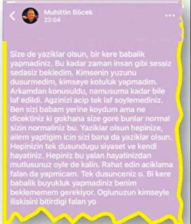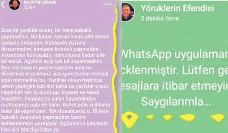 Süreç devam ederken Muhittin Böcek, gelininin kendisine gönderdiği sitem dolu mesajları, mesajlaşma uygulaması WhatsApp durumundan paylaşınca olanlar olmuştu. CHP'li Antalya Büyükşehir Belediye Başkanı Muhittin Böcek'in geçtiğimiz yıl oğlu Gökhan Böcek'e ile evlenen gelini, eşinin kendisini aldattığı gerekçesiyle boşanma davası açtı. Süreç devam ederken Muhittin Böcek, gelinin kendisine gönderdiği sitem dolu mesajları, mesajlaşma uygulaması WhatsApp durumundan paylaşmıştı.