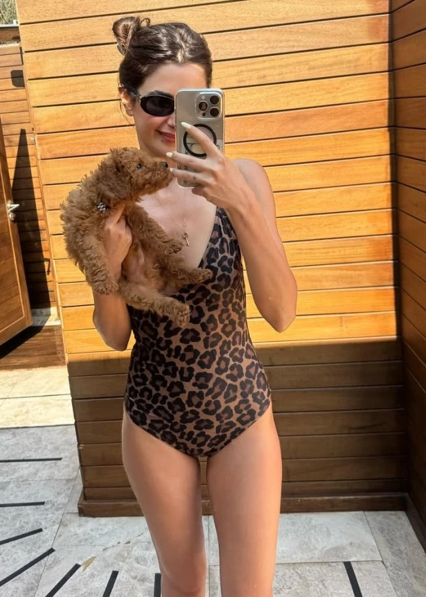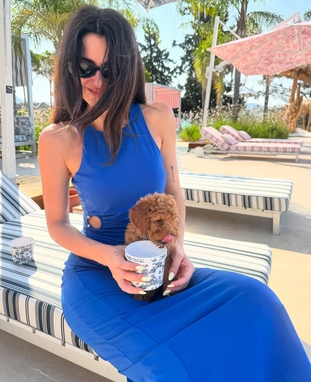 Sevimli köpeği 'Dolce' ile tatile çıkan oyuncu, güneşin ve denizin tadını çıkararak keyifli anlar geçirdi.