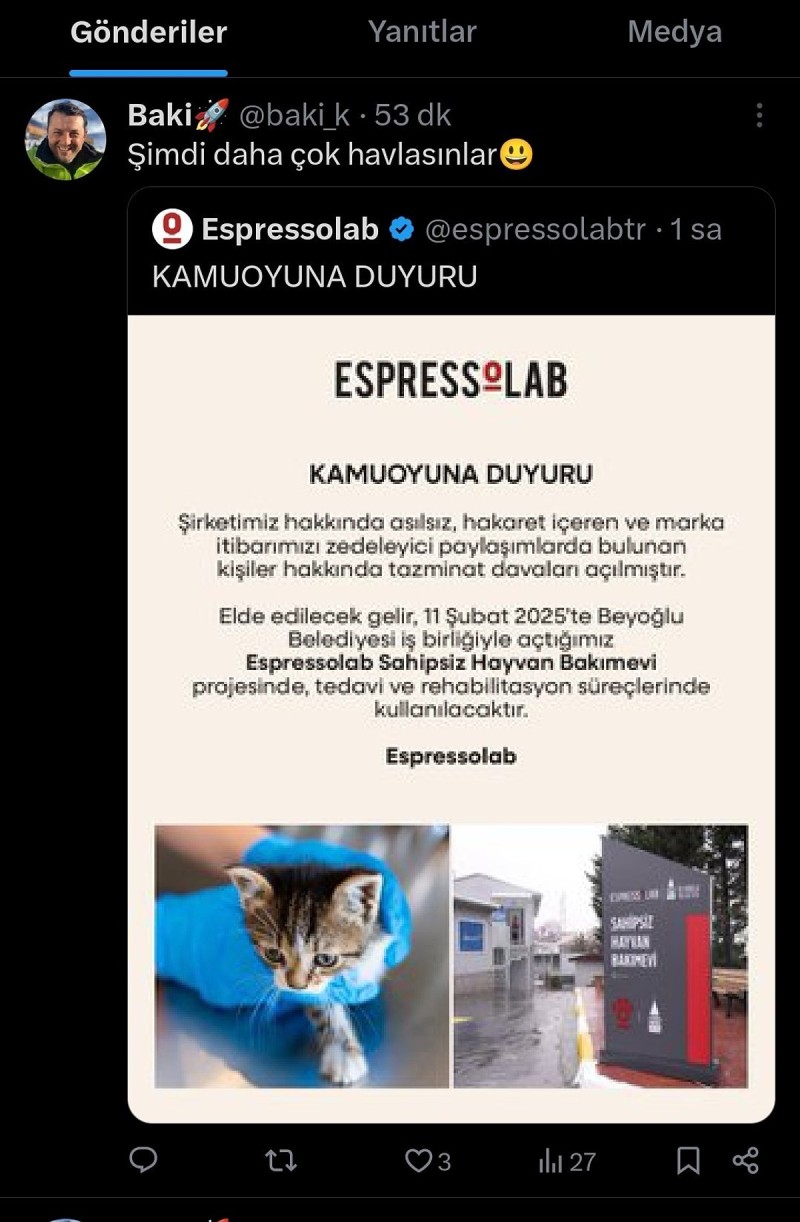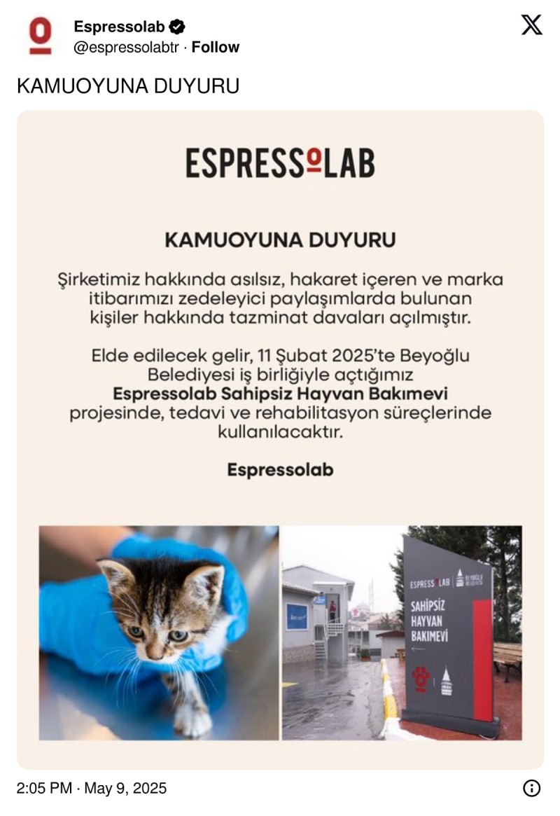 şirket hakkında gerçeğe aykırı, hakaret içeren ve marka değerini olumsuz etkileyen paylaşımlarda bulunan kişiler hakkında tazminat davaları açıldığı belirtildi. Açıklamada ayrıca, bu davalardan elde edilecek gelirin, 11 Şubat 2025 tarihinde Beyoğlu Belediyesi iş birliğiyle hayata geçirilen Espressolab Sahipsiz Hayvan Basımevi projesinde, sokak hayvanlarının tedavi ve rehabilitasyon