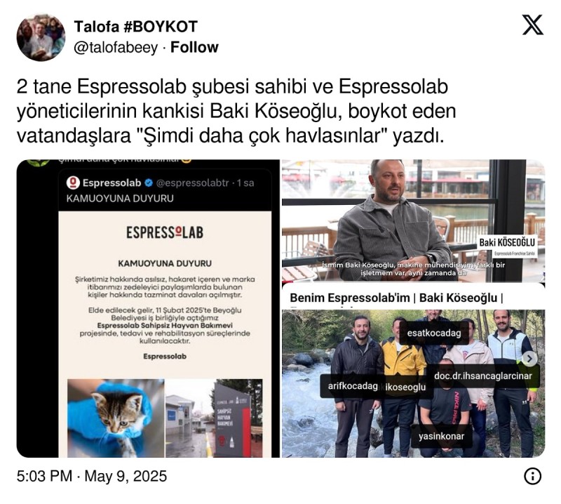 "Espressolab’ın iki şubesinin sahibi ve yöneticilerle yakın ilişkisi olan Baki Köseoğlu, boykot çağrısı yapan vatandaşlara 'Şimdi daha çok havlasınlar' şeklinde bir yorumda bulundu."