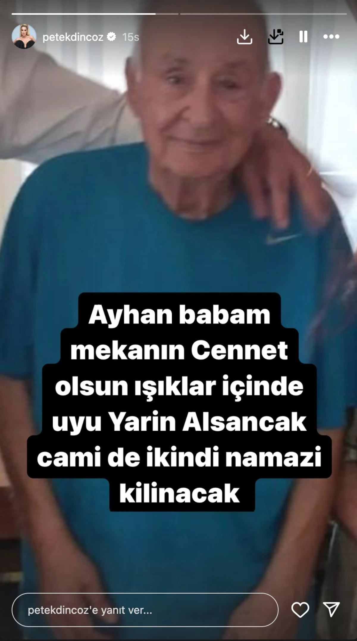 Acısını duygusal sözlerle dile getiren Dinçöz, paylaşımında “Ayhan babam, mekanın cennet olsun. Işıklar içinde uyu. Cenazemiz Alsancak Camii’nde ikindi namazının ardından kaldırılacak.” ifadelerine yer verdi.