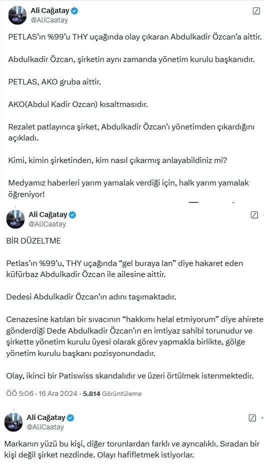 "Petlas’ın yüzde 99’u, THY uçağında “gel buraya lan” diye hakaret eden küfürbaz Abdulkadir Özcan ile ailesine aittir. Dedesi Abdulkadir Özcan’ın adını taşımaktadır. Cenazesine katılan bir sıvacının “hakkımı helal etmiyorum” diye ahirete gönderdiği Dede Abdulkadir Özcan’ın en imtiyaz sahibi torunudur ve şirkette yönetim kurulu üyesi olarak görev yapmakla birlikte, gölge yönetim kurulu başkanı pozisyonundadır. Olay, ikinci bir Patiswiss skandalıdır ve üzeri örtülmek istenmektedir.