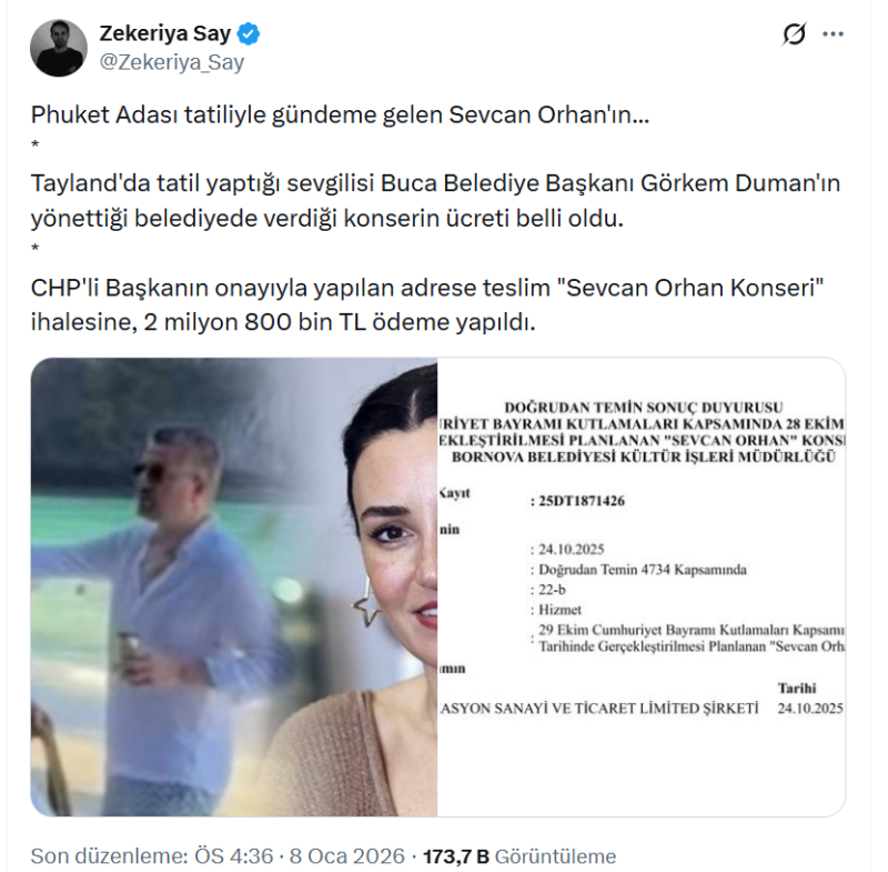 İddiaya göre; Orhan’ın tatilini birlikte geçirdiği CHP’li Başkan Görkem Duman’ın yönettiği Buca Belediyesi, sanatçının sahne aldığı konser için 2 milyon 800 bin TL ödeme yaptı.
