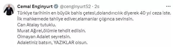 "Türkiye tarihinin en büyük bahis çetesi, dolandırıcılık diyerek 40 yıl ceza iste. İlk mahkemede tahliye ediver, elamanlar çılgınca sevinsin. Can Atalay tutuklu. Murat Ağırel, ölümle tehdit edilsin. Olmayan Adalet seyretsin. Adaletiniz batsın, yazıklar olsun."
