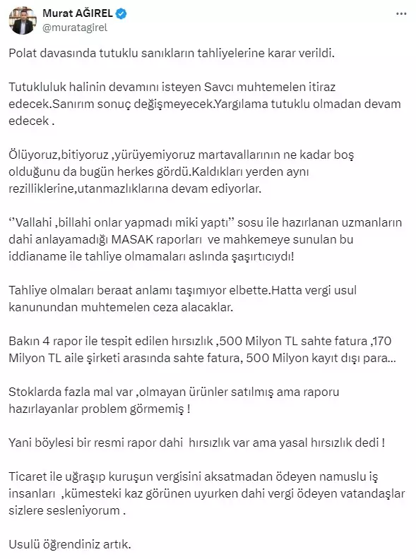 "Polat davasında tutuklu sanıkların tahliyelerine karar verildi. Tutukluluk halinin devamını isteyen Savcı muhtemelen itiraz edecek. Sanırım sonuç değişmeyecek. Yargılama tutuklu olmadan devam edecek. Ölüyoruz, bitiyoruz, yürüyemiyoruz martavallarının ne kadar boş olduğunu da bugün herkes gördü. Kaldıkları yerden aynı rezilliklerine, utanmazlıklarına devam ediyorlar. Vallahi ,billahi onlar yapmadı miki yaptı" sosu ile hazırlanan uzmanların dahi anlayamadığı MASAK raporları ve mahkemeye sunulan bu iddianame ile tahliye olmamaları aslında şaşırtıcıydı! Tahliye olmaları beraat anlamı taşımıyor elbette. Hatta vergi usul kanunundan muhtemelen ceza alacaklar. Bakın 4 rapor ile tespit edilen hırsızlık ,500 Milyon TL sahte fatura ,170 Milyon TL aile şirketi arasında sahte fatura, 500 Milyon kayıt dışı para… Stoklarda fazla mal var ,olmayan ürünler satılmış ama raporu hazırlayanlar problem görmemiş! Yani böylesi bir resmi rapor dahi hırsızlık var ama yasal hırsızlık dedi! Ticaret ile uğraşıp kuruşun vergisini aksatmadan ödeyen namuslu iş insanları, kümesteki kaz görünen uyurken dahi vergi ödeyen vatandaşlar sizlere sesleniyorum . Usulü öğrendiniz artık."
