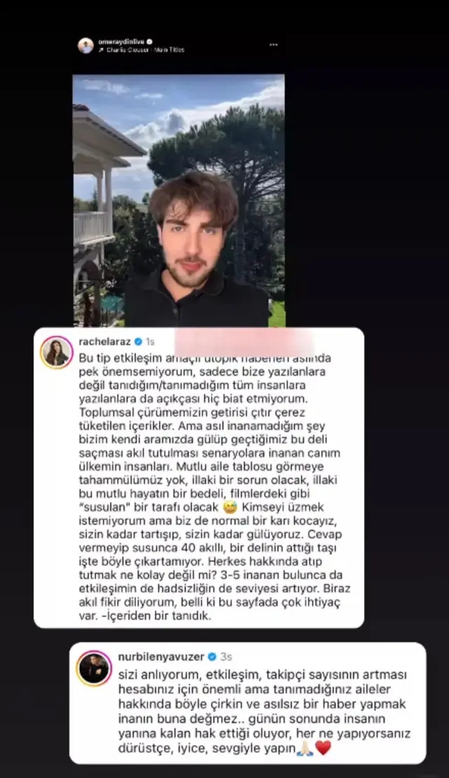 Rachel Araz açıklamasında "Mutlu aile tablosu görmeye tahammülünüz yok, illaki bir sorun olacak, illaki bu mutlu hayatın bir bedeli, filmlerdeki gibi 'susulan' bir tarafı olacak. Kimseyi üzmek istemiyorum ama biz de normal karı kocayız. Herkes hakkında atıp tutmak ne kolay değil mi?" dedi.
