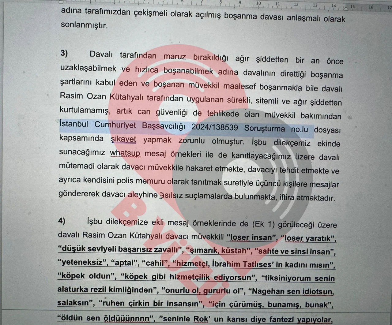 Gazete Duvar'ın aktardığına göre Nagehan Alçı’nın boşanma kararından sonra da Rasim Ozan Kütahyalı’nın ağır şiddetinden kurtulamadığının ileri sürüldüğü dilekçede, “Artık can güvenliği de tehlikede olan müvekkil bakımından şikayet yapmak zorunlu olmuştur. İşbu dilekçemiz ekinde sunacağımız WhatsApp mesaj örnekleri ile de kanıtlayacağımız üzere davalı mütemadi olarak davacı müvekkile hakaret etmekte, davacıyı tehdit etmekte ve ayrıca kendisini polis memuru olarak tanıtmak suretiyle üçüncü kişilere mesajlar göndererek davacı aleyhine asılsız suçlamalarda bulunmakta, iftira atmaktadır” ifadeleri kullanıldı.