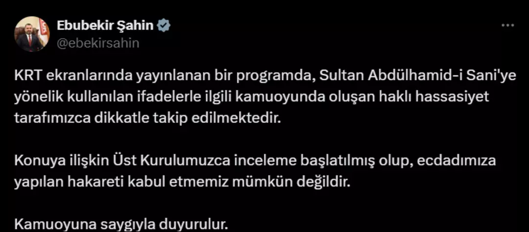 RTÜK Başkanı Ebubekir Şahin, sosyal medya hesabından yaptığı açıklamada KRT'de yayınlanan programda Sultan II. Abdülhamid’e yönelik kullanılan ifadelerle ilgili kamuoyunda oluşan hassasiyetin dikkatle izlendiğini belirtti.