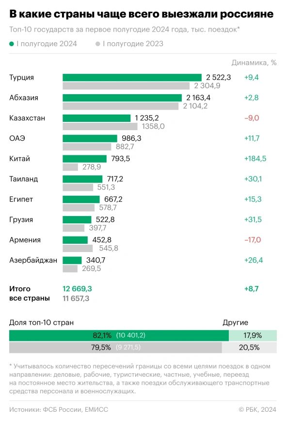 İlk altı ayda Ruslar, turizm amaçlı 4,9 milyon yurtdışı seyahati gerçekleştirdi, bu da bir önceki yıla göre %20'lik bir artış anlamına geldi.