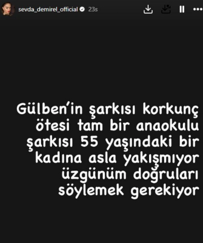 Gülben Ergen'in yeni şarkısından bir kesit dinleyen Sevda Demirel, Instagram hesabından yaptığı paylaşımda "Gülben'in şarkısı korkunç ötesi, tam bir anaokulu şarkısı. 55 yaşındaki bir kadına asla yakışmıyor. Üzgünüm doğruları söylemek gerekiyor" dedi. Gülben Ergen'in tartışmanın fitilini ateşleyen Demirel'e cevap verip vermeyeceği ise merak konusu oldu.