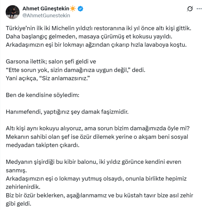 Güneştekin, bu tavrı “damak faşizmi” olarak tanımladığını ifade etti ve restoranın sorumluluk almak yerine kendisini sosyal medyadan engellediğini belirterek devam etti: