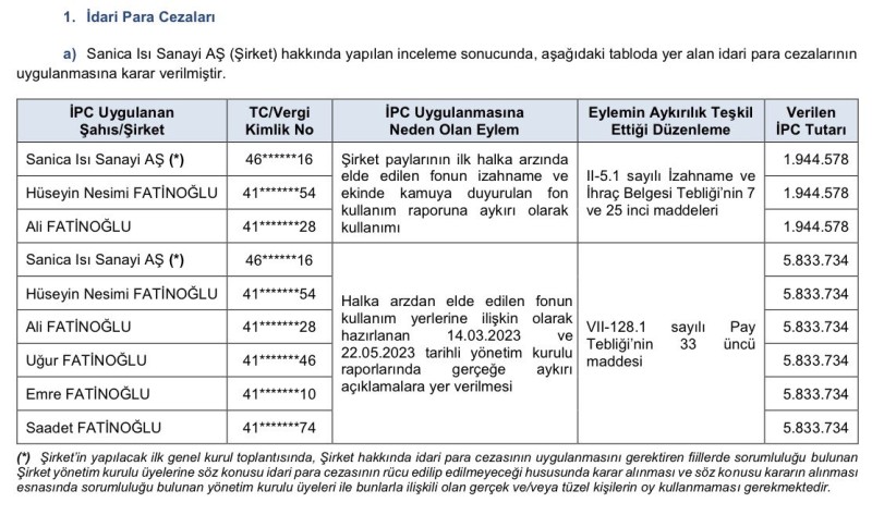 Bu kapsamda Sanica Isı Sanayi AŞ’ye ve bazı yöneticilere yaklaşık 1,94 milyon TL ile 5,83 milyon TL arasında değişen tutarlarda idari para cezaları kesildi.