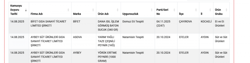 Tarım ve Orman Bakanlığı "Sağlığı Tehlikeye Düşürecek Gıdalar" listesini güncelledi. Listeye 3 yeni ihlal eklendi. Bunlardan en dikkat çekici olanı daha önce domuz eti kullandığı tespit edilen Bifet adlı markanın sucuğunda yine domuz eti çıkması.