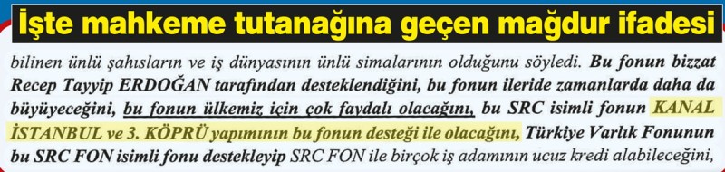 “İshak isimli şahıs bana SRC Fon isimli bir şirketin olduğunu, bu fonda tanınan bilinen ünlü şahısların ve iş dünyasının ünlü simalarının olduğunu söyledi. Bu fonun bizzat Erdoğan tarafından desteklendiğini, ileride daha da büyüyeceğini, bu fonun ülkemiz için çok faydalı olacağını, Kanal İstanbul ve 3. Köprü’nün bu fonun desteği ile yapılacağını, Türkiye Varlık Fonu’nun bu fonu destekleyeceğini, katılanların ucuz kredi de çekebileceği belirtti...”