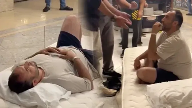 Görüşme talebinin kabul edilmemesi üzerine odasına giderek yatağını alan müşteri, otelin yemekhanesine gelerek protesto gösterisi düzenledi. Turistlerin bakışları arasında yaşananlar kaydedilirken, o görüntüler sosyal medyada gündem oldu.
