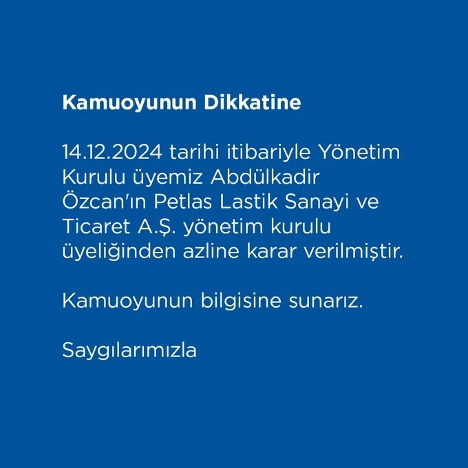 “14 Aralık 2024 tarihi itibariyle yönetim kurulu üyemiz Abdulkadir Özcan’ın Petlas Lastik Sanayi ve Ticaret A.Ş. yönetim kurulu üyeliğinden azline karar verilmiştir. Kamuoyunun bilgisine sunarız. Saygılarımızla.”