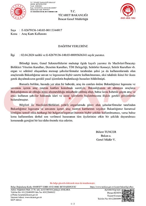 “Bilgileri ile Meclisleri/Birlikleri yetkili organlarında görev alan şahıslar/firmalar tarafından Bakanlığımız logosunu ve unvanını içeren araç tanıtım kartlarının veya Bakanlığımız kurumsal kimliğini temsil eden herhangi bir belgenin/logonun/ibarenin hiçbir şekilde kullanılmaması, varsa bahse konu kullanımlara derhal son verilmesi hususunun tüm üyelerinize etkin bir şekilde duyurulması önemle rica edilir.”