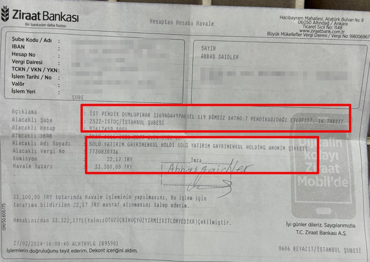 Halktv.com.tr’nin edindiği belgelere göre önemli bir bölümü İranlı onlarca kişi Cengiz’in kontrolü altındaki Solo Yatırım Holding ile daire satın satışı için sözleşme imzaladı. Bu kişiler, ödemelerinin büyük bir bölümünü yapmalarına karşın tapularını alamadı.