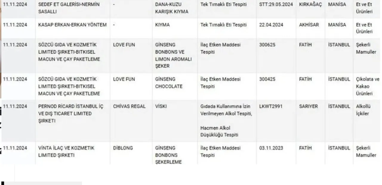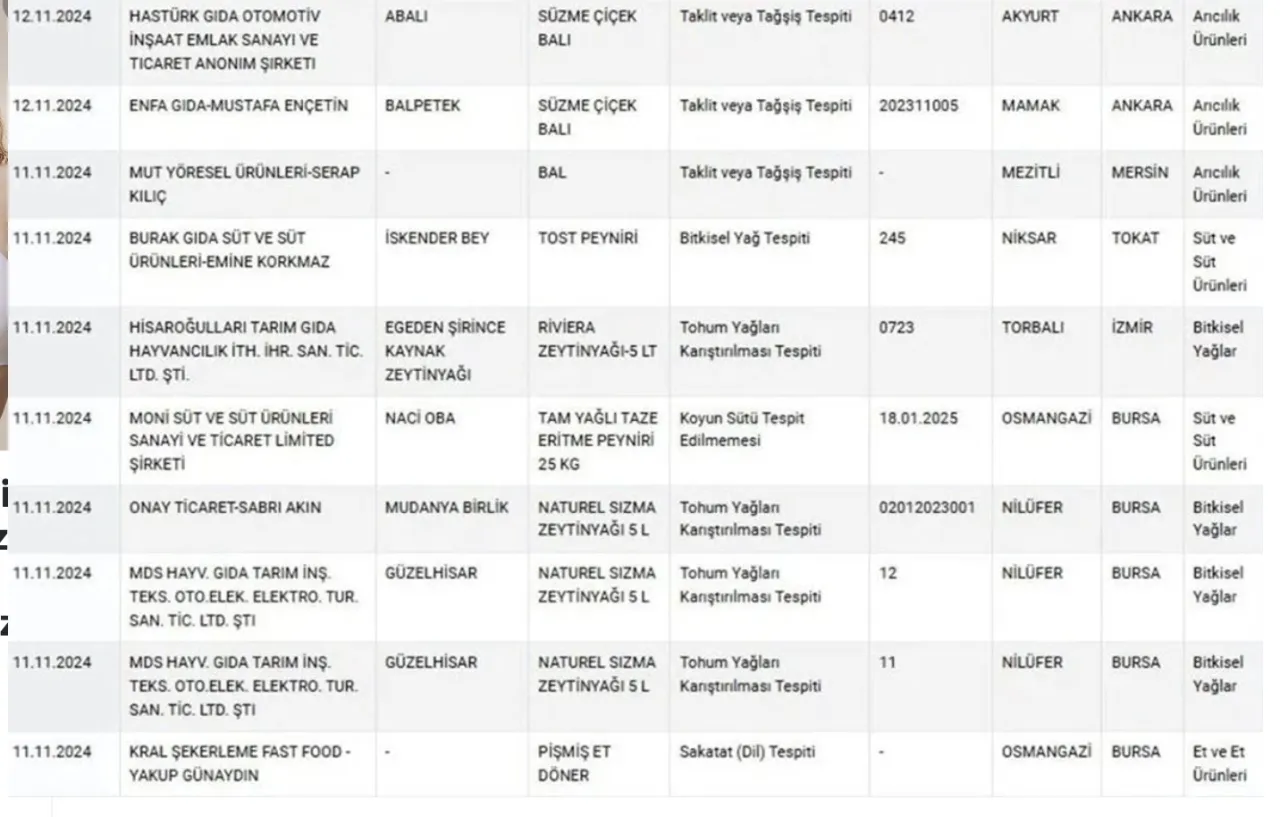 Sağlığı tehlikeye düşürebilecek gıdalar listesi güncellendi. En dikkat çeken bulgulardan biri, kıyma örneklerinde at ve eşek eti bulunması oldu. Dönerde ise dil eti kullanıldığı belirlendi. Ayrıca, koyun peyniri olarak satılan bir ürünün incelenmesinde koyun sütü yerine farklı bir süt türü kullanıldığı tespit edildi. Listeye giren bir diğer skandal ise iki tanınmış bal markası oldu. Bu markaların ürünlerinde bal yerine farklı maddeler kullanıldığı ortaya çıktı.