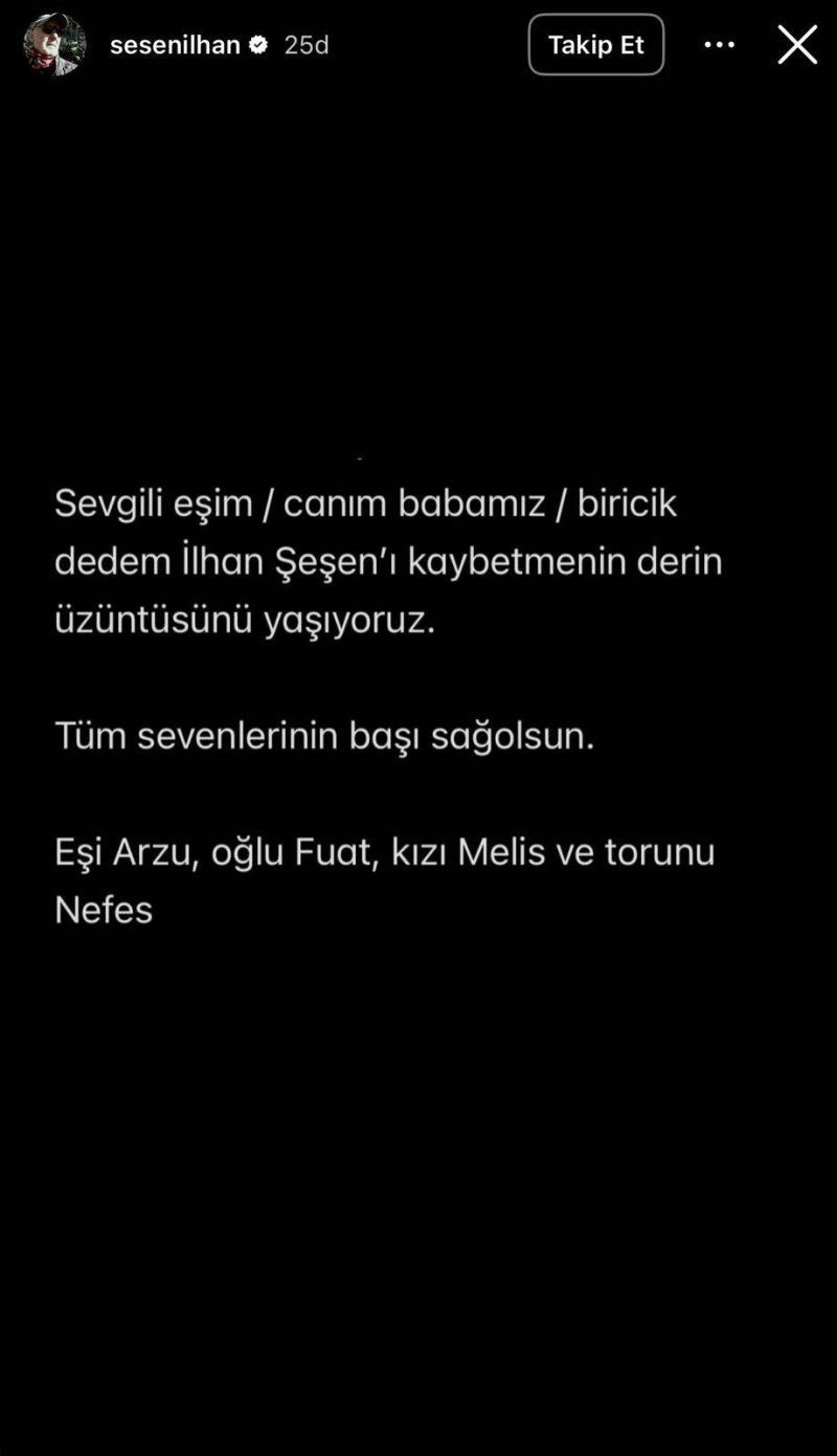 İlhan Şeşen’in ailesi, sosyal medya hesabından yaptığı açıklamada şu ifadelere yer verdi: “Sevgili eşimiz, canımız babamız ve biricik dedemiz İlhan Şeşen’i kaybetmenin derin acısını yaşıyoruz. Tüm sevenlerimizin başı sağ olsun.” Mesaj, eşi Arzu, oğlu Fuat, kızı Melis ve torunu Nefes tarafından paylaşıldı.