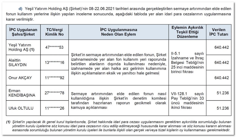 SPK, Yeşil Yatırım Holding’e Şirket’in sermaye artırımından elde edilen fonun, Şirket izahnamesinde yer alan fon kullanım yeri raporunda belirtilen alanların dışında kullanılması nedeniyle idari para cezası verdi.