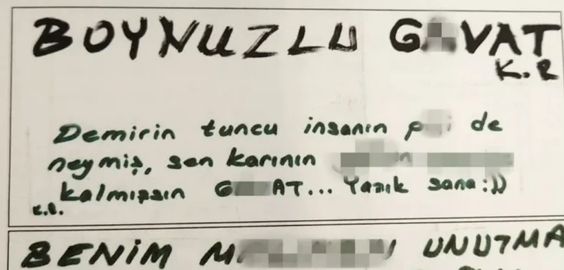 Yaptıklarıyla durmak bilmeyen kadın ayrıca zarar verdiği otomobilin üstüne, "Demirin tuncu insanın p.çi de neymiş, sen karının... kalmışsın g.vat, yazık sana :)) boynuzlu g.vat" yazılı not bıraktı.