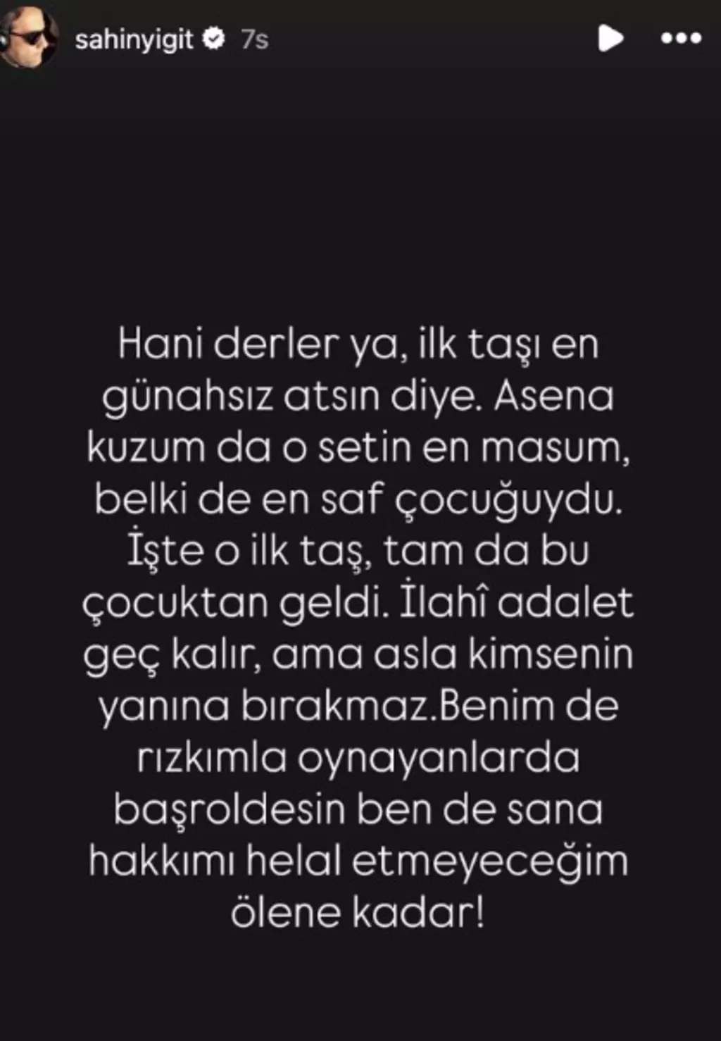 “Hani derler ya, ilk taşı en günahsız atsın. Asena kuzum o setin en masum, en saf çocuğuydu. İlk taş tam da ondan geldi. İlahi adalet geç kalır ama asla kimsenin yanına bırakmaz. Benim de rızkımla oynayanlarda başroldesin. Sana hakkımı helal etmeyeceğim ölene kadar.”