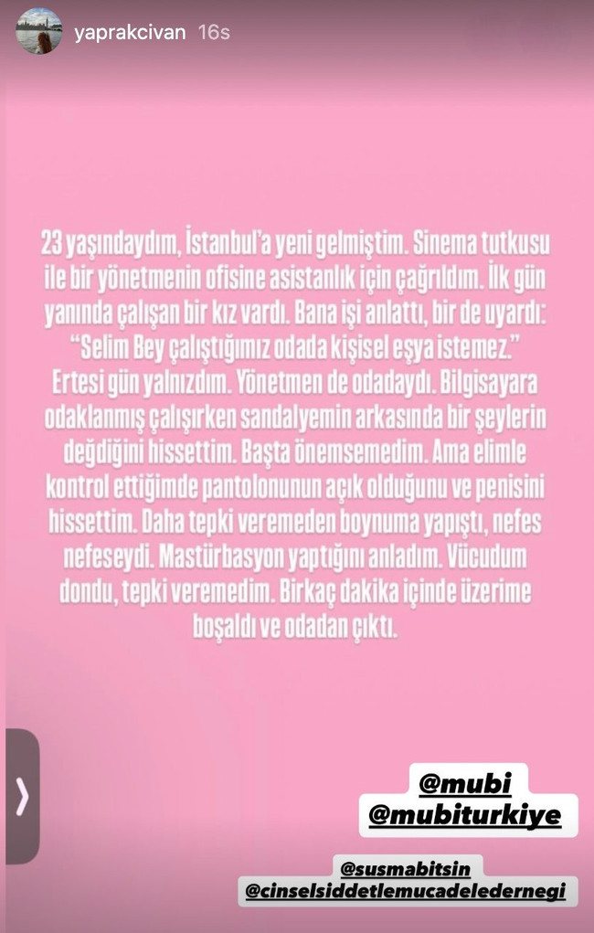Sosyal medya hesabından paylaşım yapan Civan, 2018 yılında yönetmen Selim Evci'nin ofisine asistanlık için çağrıldığını belirtti.