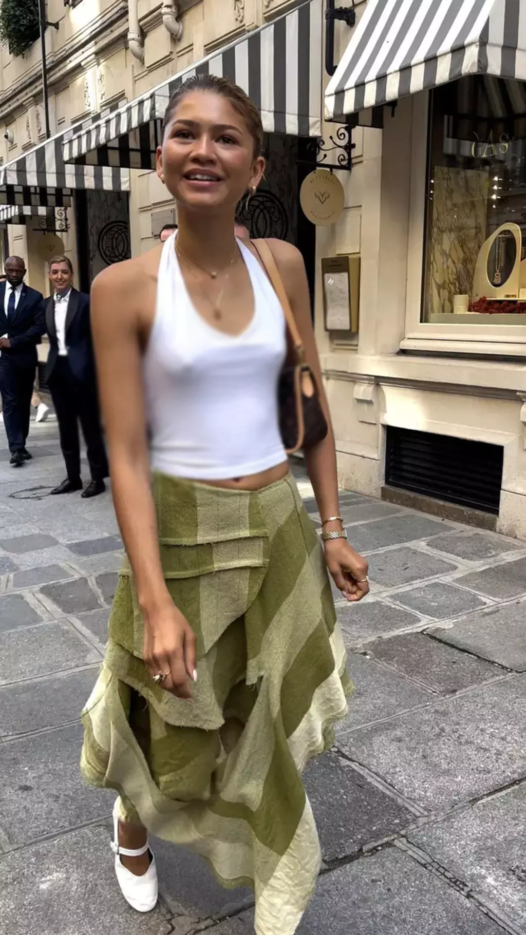 Kombinini yeşil renklerindeki ilginç eteğiyle tamamlayan Zendaya beyaz ayakkabıları ve gold takılarıyla hiç beğenilmedi.