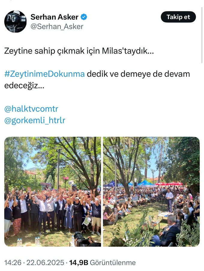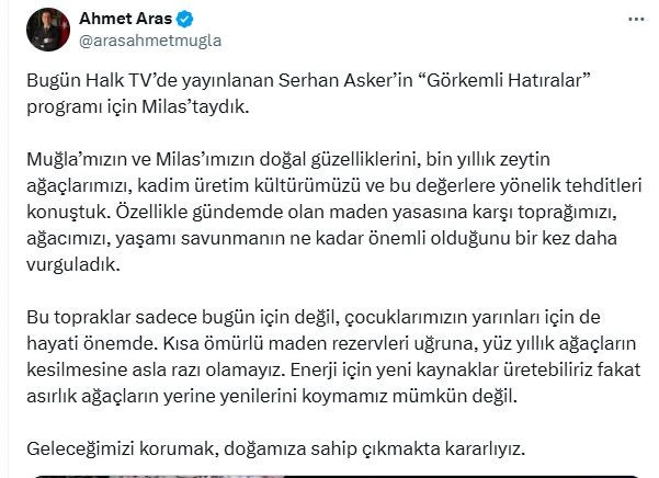 “Bugün Halk TV’de yayınlanan Serhan Asker’in ‘Görkemli Hatıralar’ programı için Milas’taydık. Muğla’mızın ve Milas’ımızın doğal güzelliklerini, bin yıllık zeytin ağaçlarımızı, kadim üretim kültürümüzü ve bu değerlere yönelik tehditleri konuştuk... Geleceğimizi korumak, doğamıza sahip çıkmakta kararlıyız.”